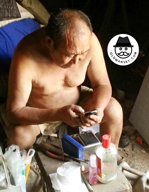 Old daddy wore white vest undershirt and blue middle pants called happily