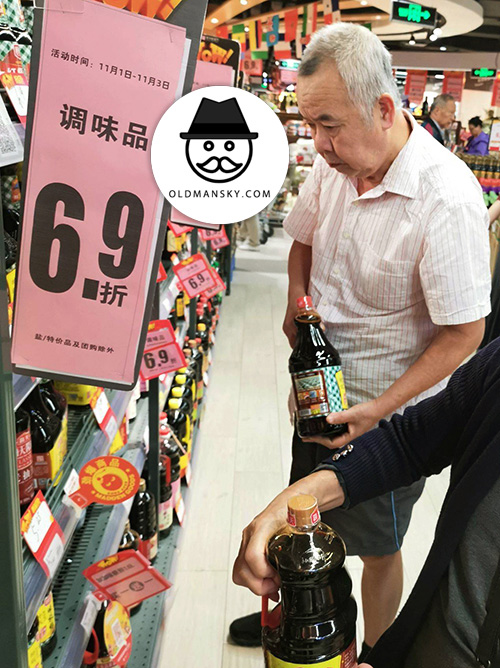 White hair old man bought soy sauce in the supermarket
